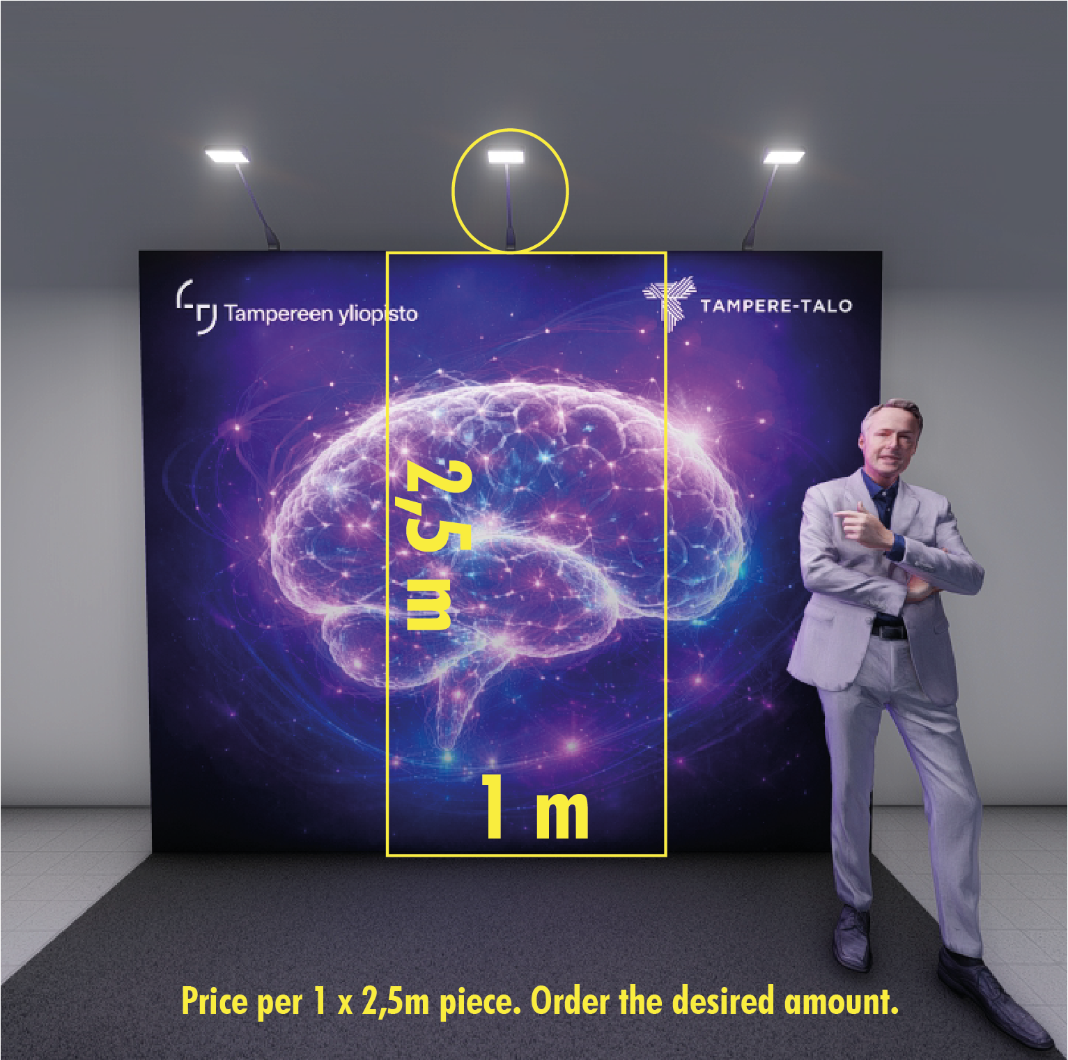 PLEASE NOTE: If for instance you need a 3 meter (3×2,5m) back wall, order 3 pieces. In this instances, we would provide a branded back wall 3×2,5m + 3 display lights.