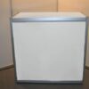 Liukuovikaappi, alumiiniprofiilirunkoinen kaappi, korkeus 100 cm, leveys 103 cm, syvyys 53 cm, perustoimitus: kansi: valkea melamiinipintainen ”uppokansi”, koko 47×97 cm, etulevyn näkyvä osa”; tila johon voi kiinnittää julisteen tai teipata logon / tekstiä, korkeus 89 cm,leveys 97 cm. kylkilevyjen ”näkyvä osa”, korkeus 89 cm, leveys 47 cm, kaapissa ei ole välihyllyä eikä pohjalevyä, ruuvattavat säätöjalat. Kysy eri värivaihtoehtoja!