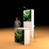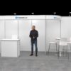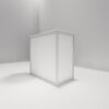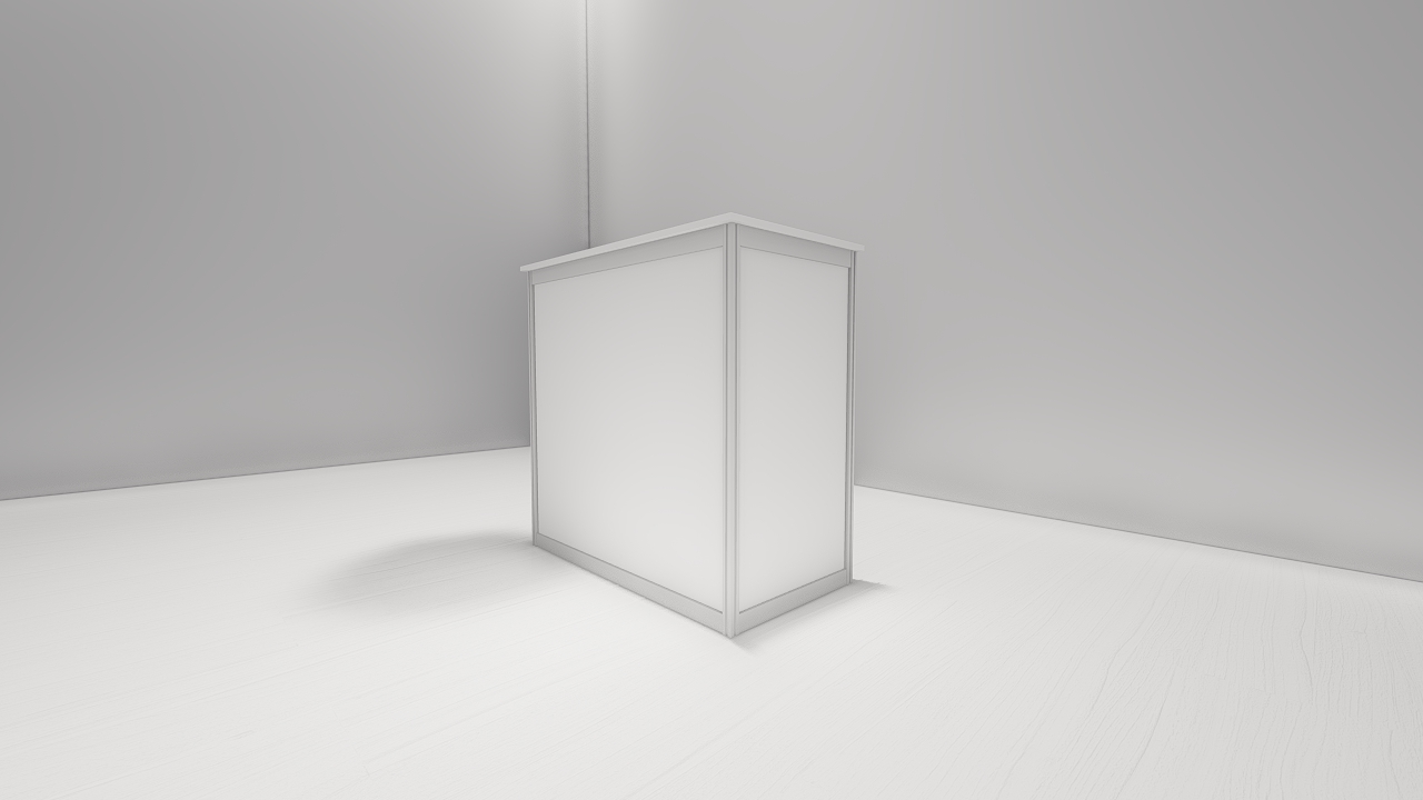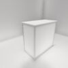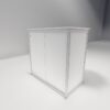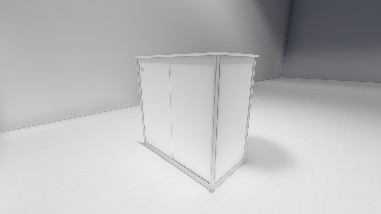 Liukuovikaappi, alumiiniprofiilirunkoinen kaappi, korkeus 100 cm, leveys 103 cm, syvyys 53 cm, perustoimitus: kansi: valkea melamiinipintainen ”uppokansi”, koko 47×97 cm, etulevyn näkyvä osa”; tila johon voi kiinnittää julisteen tai teipata logon / tekstiä, korkeus 89 cm,leveys 97 cm. kylkilevyjen ”näkyvä osa”, korkeus 89 cm, leveys 47 cm, kaapissa ei ole välihyllyä eikä pohjalevyä, ruuvattavat säätöjalat