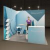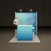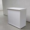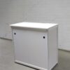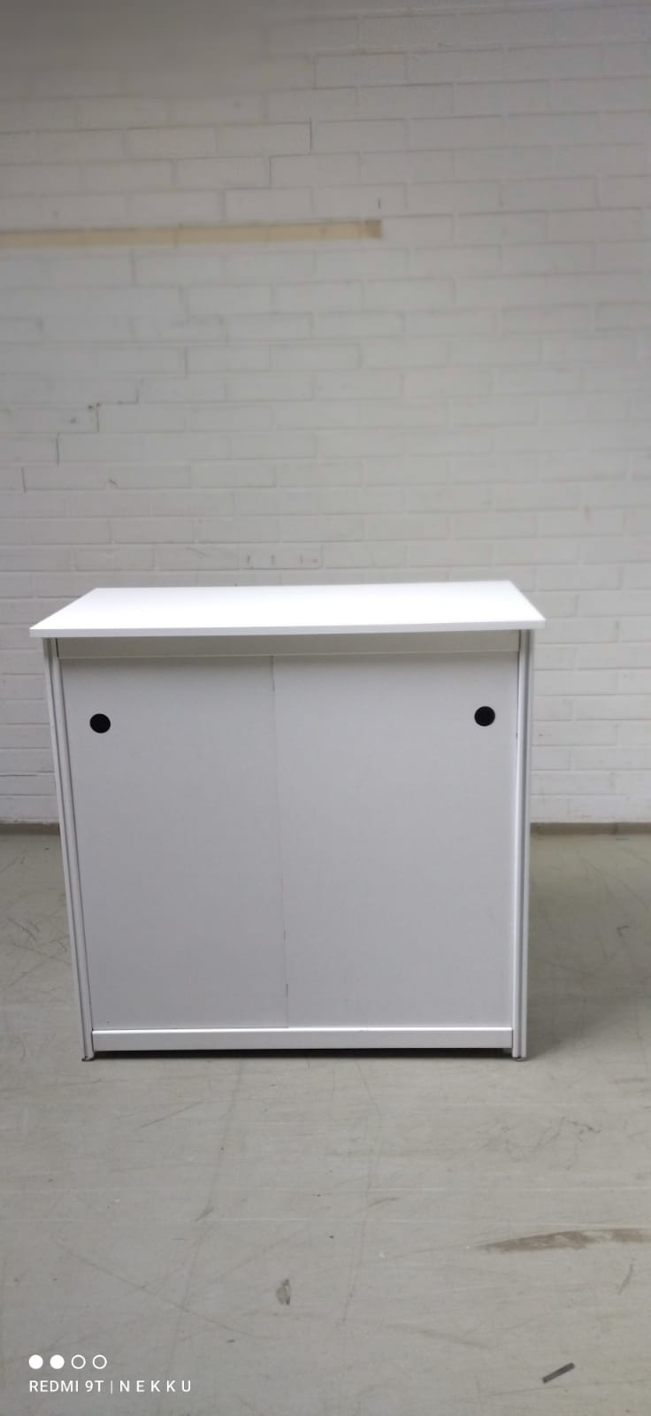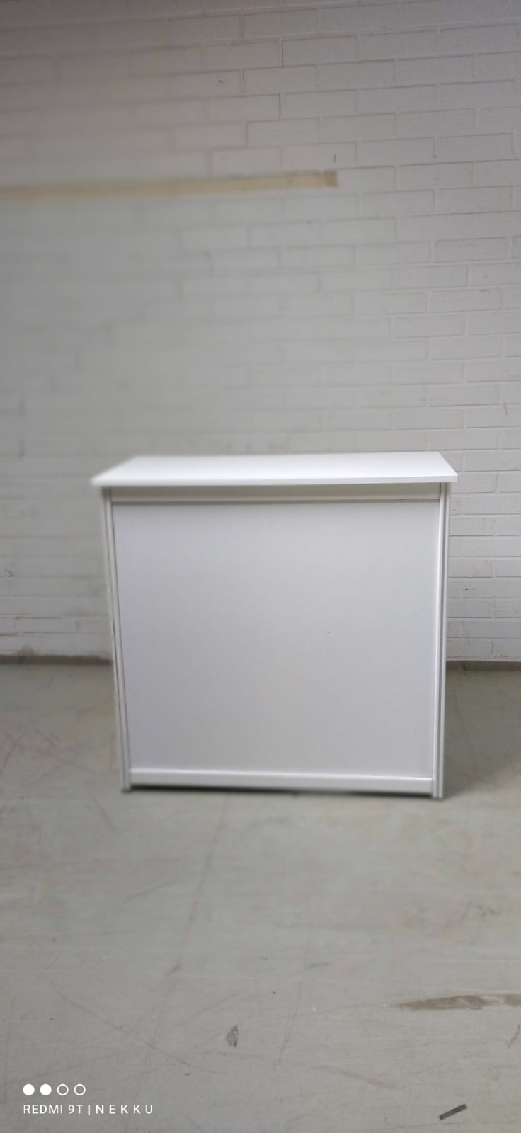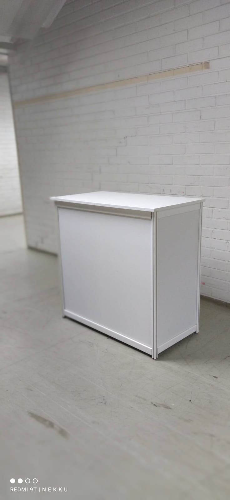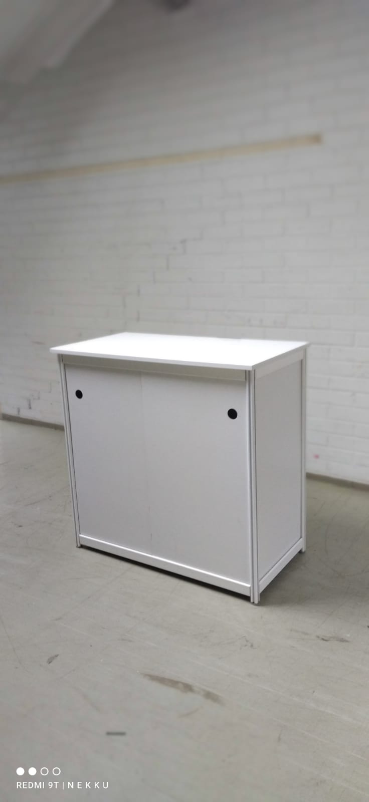 Liukuovikaappi, alumiiniprofiilirunkoinen kaappi, korkeus 100 cm, leveys 103 cm, syvyys 53 cm, perustoimitus: kansi: valkea melamiinipintainen päällikansi, koko 56×106 cm, etulevyn näkyvä osa”; tila johon voi kiinnittää julisteen tai teipata logon / tekstiä, korkeus 89 cm,leveys 97 cm. kylkilevyjen ”näkyvä osa”, korkeus 89 cm, leveys 47 cm, kaapissa ei ole välihyllyä eikä pohjalevyä, ruuvattavat säätöjalat