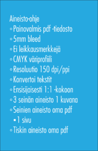 Tarkista painoaineiston koko osastoesitteestä tai kysy taikalyhty@taikalyhty.fi